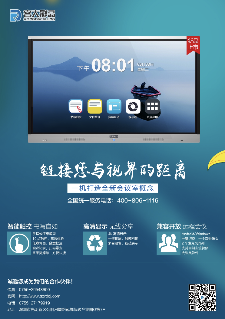 容大彩晶會(huì)議一體機(jī)將白板書(shū)寫(xiě)、無(wú)線投屏、視頻會(huì)議、遠(yuǎn)程協(xié)作、會(huì)議記錄、雙系統(tǒng),六大功能集于一體,移動(dòng)方便、開(kāi)機(jī)即用,全面滿足遠(yuǎn)程會(huì)議等使用需求,帶給用戶極致體驗(yàn)。