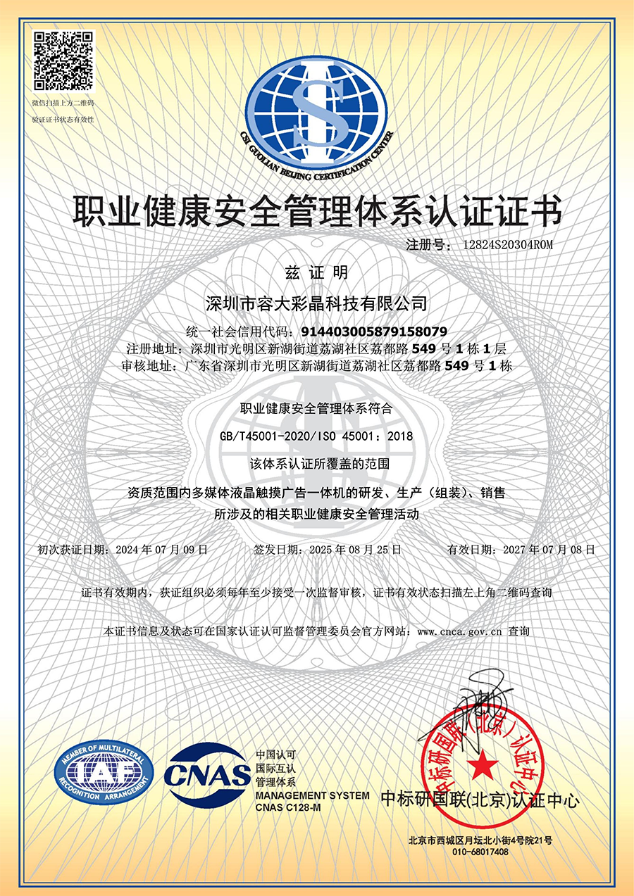 深圳市容大彩晶科技有限公司董事長/朱忠敬先生表示:“員工是我們最寶貴的財富。他們的健康和安全永遠是公司的頭等大事。獲得ISO 45001認證不僅僅是為了滿足標準要求,更是我們企業(yè)文化內(nèi)核的體現(xiàn)。它證明了我們?yōu)槊恳晃粏T工創(chuàng)造一個安全、健康、體面工作環(huán)境的堅定承諾。這將為公司的穩(wěn)健運營和長遠發(fā)展奠定堅實的基礎(chǔ)。”