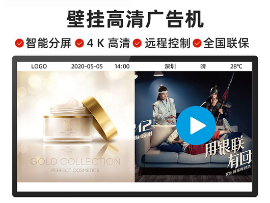 容大彩晶液晶廣告機是一種全新的媒體播放產(chǎn)品,可壁掛、吊掛、懸掛、橫豎通用的高清液晶廣告機,一般應(yīng)用在大型商場、超市、酒店大堂、飯店、影院及其他人流匯聚的公共場所等。壁掛廣告機網(wǎng)絡(luò)版可通過USB、TF卡輸入播放節(jié)目信息,還可以連接網(wǎng)絡(luò),進(jìn)行遠(yuǎn)程操控及管理;可設(shè)置多時段定時開關(guān)機,無需專人職守;可遙控設(shè)置,操作方便并提高保密性;雙重防盜,配備門鎖保護(hù),防止多媒體卡被盜和文件內(nèi)容的泄漏;是當(dāng)前廣告?zhèn)髅降闹髁餍问健?/p>